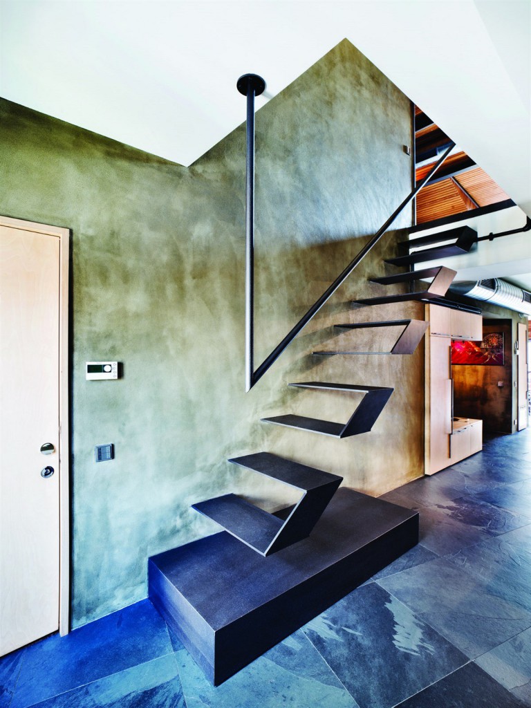 - Сталь. Естественно, что она идет на первом месте, это самый популярный металл. По своим механическим качествам она идеально подходит для возведения металлических лестниц. При этом она может быть хромирована, воронена или покрашена, что дает широчайший выбор вариантов применения в интерьере. Они варьируются в широком диапазоне – начиная от рабочих уличных лестниц из листовой сетки, до утонченных изделий в стиле хай-тек. К недостаткам можно отнести высокий вес сооружения, который значительно повышает нагрузку и требует усиления фундамента и прилегающих стен.