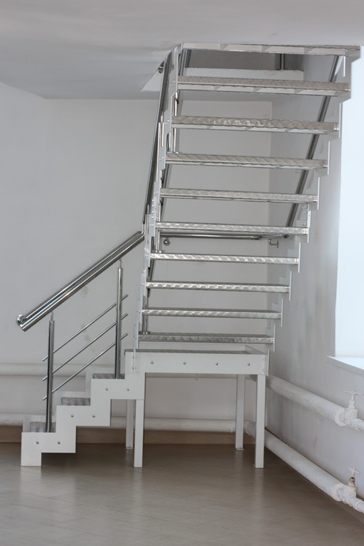 - Алюминий. Изящный и легкий металл, визуально облегчающий лестницу на второй этаж. Светлый цвет самого материала прекрасно сочетается с легкими и светлыми интерьерами, поэтому проблем с вписыванием лестницы в дизайн помещения не может быть. Недостатков практически нет, но конечное изделие стоит несколько больше аналога из стали.