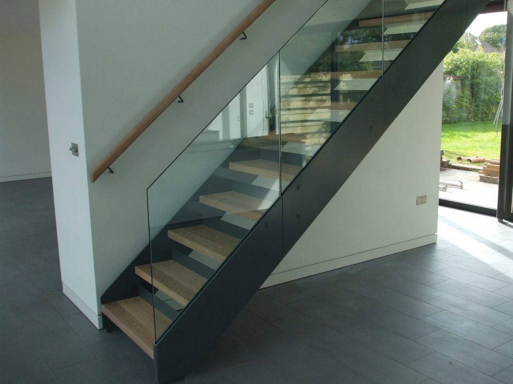- На тетиве. Ступени крепятся к несущему элементу – тетиве, располагающейся сбоку от них. Таким образом, если в косоуровневой системе ступени расположены сверху несущих балок, то в этой они располагаются между ними в жестком каркасе.